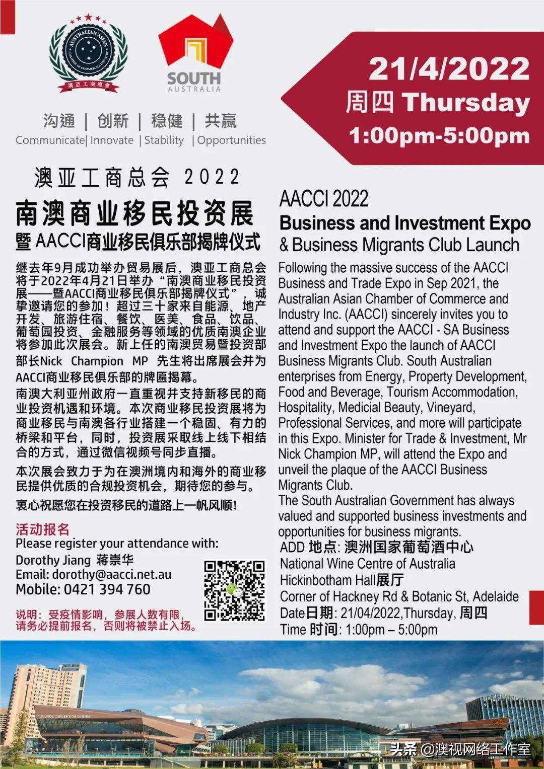 在疫情期间,澳亚工商总会AACCI成功的举办了14场重要的活动,宣传推广南澳,为南澳的经济复苏作出了巨大的贡献。继去年9月成功举办贸易展后,澳亚工商总会AACCI将于2022年4月21日举办南澳商业移民投资展—暨AACCI商业移民俱乐部揭牌仪式!多家来自能源、地产开发、旅游住宿、食品、饮品、葡萄园投资、金融服务等领域的优质南澳企业将参加此次展会。
