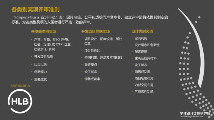 2022年是该奖项系列设立后的第17个年头,迄今已覆盖亚太区12个主要的房地产市场。该奖项系列以诚信、公平、透明享誉亚太地区,由区域内房地产行业各界精英组成的独立评审团, 以及由广受信赖的浩信国际(HLB)担当评奖监督,保证了这一奖项系列的公正评审和顺利实施。毋庸置疑,PropertyGuru亚洲不动产奖已成为亚太地区房地产 行业的黄金标准。