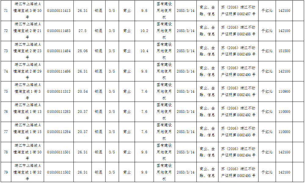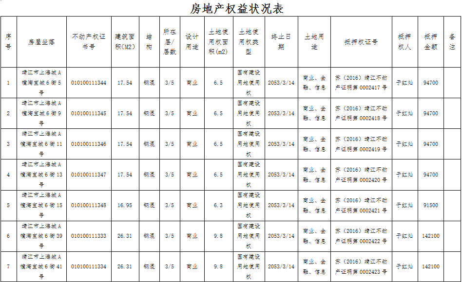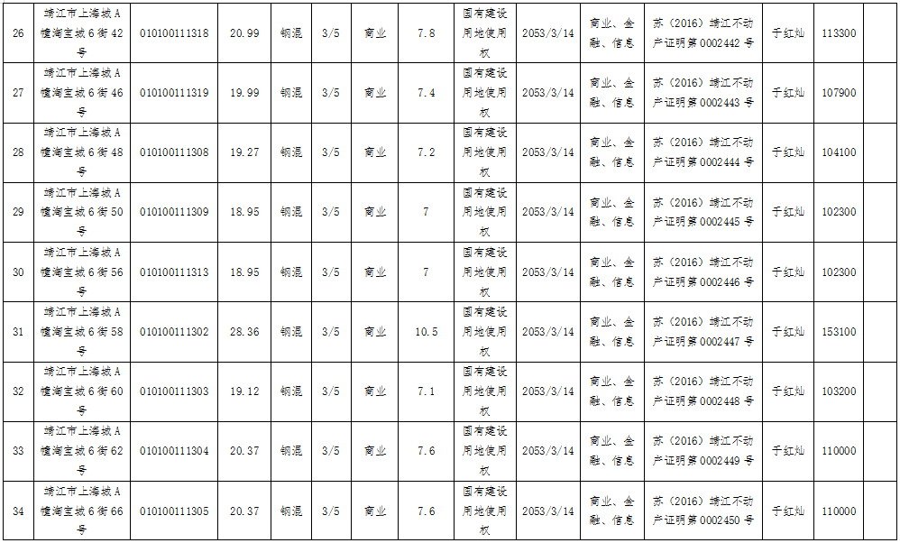 而此次拍卖的房产主要位于靖江上海城三楼原淘宝城共计139套商业房产。总起拍价:23674680元。具体房地产明细如下: