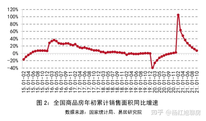 从月度情况来看,本轮楼市上升周期,2016年-2019年,房地产开发投资同比增速持续震荡式上行。2020年年初受疫情影响,房地产开发投资同比增速大幅下降,随着疫情的控制和复工复产的有序推进,6月增速转正。2021年,1-2月受去年疫情同期低基数的影响,全国房地产开发投资同比大幅上升,3月开始年初累计增速持续下滑;单月数据来看,9月已经开始转降,10月降幅扩大。