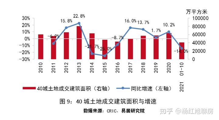 回顾近几年40城土地市场表现。2011年在限购、限贷等政策影响下,市场降温。2012年市场开始回暖。2013年再度繁荣。2014年大幅下滑。2015年继续大幅下滑。2016年跌幅收窄,开始回温。2017年全国楼市火爆,土地成交大增。2018年上半年,三四线城市和部分二线城市房屋销售持续火热,开发商拿地热情高涨,下半年有所降温。2019年基本平稳,小增1.7%。2020年政策有所放松,部分热点城市地市火热,下半年政策收紧后,地市略有降温,全年增长10.2%。2021年2月在 22个试点城市推出两集中土拍政策,重庆、杭州、上海等部分城市第一批供地土拍火爆,但受房企融资困难和土拍规则升级影响,第二批供地市场大幅降温,第三批供地继续低迷;1-10月同比下降14%。