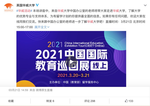 本次中国国际教育巡回展“云”端开展的展览形式,直播反响热烈,学长家长与高校机构代表互动良好,效果甚佳。优质的院校资源、丰富的直播内容,使广大网友零距离了解新冠疫情下各国高校的最新动态和招录政策变化,轻松掌握“留学”先机!