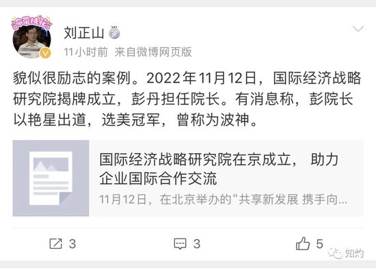 貌似很励志的案例。2022年11月12日,国际经济战略研究院揭牌成立,彭丹担任院长。有消息称,彭院长以艳星出道,选美冠军,曾称为波神。