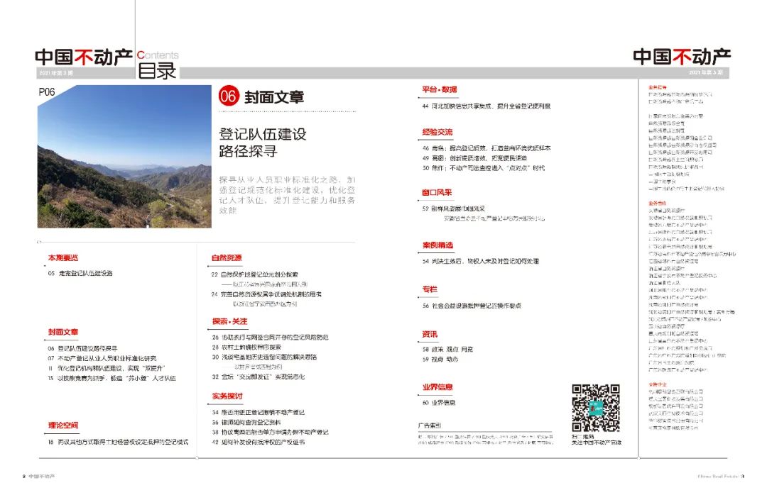 栏目标题作者本期要览走宽登记队伍建设路本刊评论员封面文章登记队伍建设路径探寻本刊编辑部封面文章不动产登记从业人员职业标准化研究吴春岐 杜建刚 张潆文 张秋琴封面文章优化登记机构和队伍建设,实现双提升宋家宁 胡利哲封面文章以技能竞赛为抓手,锻造苏小登人才队伍闫艳理论空间再议其他方式取得土地经营权设定抵押的登记模式刘旭华自然资源自然保护地登记单元划分探索
